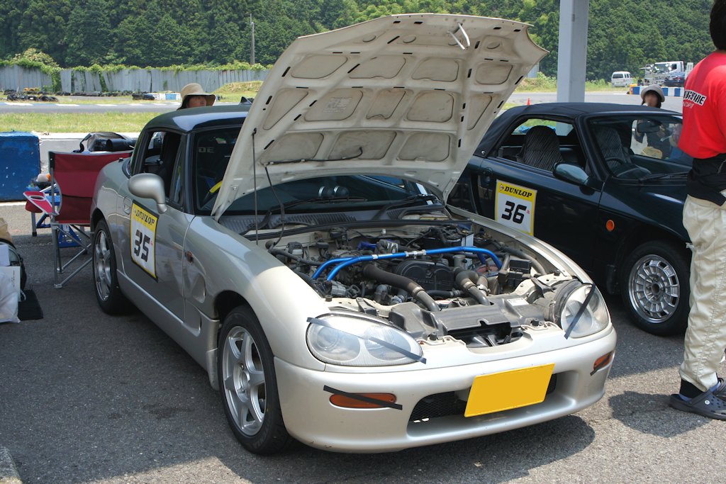 スズキ・カプチーノ(1990年式・EA11R)愛車紹介26台目 スズキ 2017年07月18日 0 今回紹介する車両は「ドンキホーテジムカーナ2017」にエントリーされていたスズキ・カプチーノです。 年式:1990年式型式:EA11Rミッション:5MT カプチーノは1989年の東京モーターショーに参考出品され、1991年11月に発売された軽自動車のオープンスポーツカーです。1998年10月まで生産され、総生産台数は26,583台にもなりました。軽自動車で初めて4輪ダブルウィッシュボーン式サスペンションを採用した車でした。車名のカプチーノは「シナモン入りエスプレッソコーヒー」であるカプチーノが由来です。飲み物のカプチーノは、小さなカップに入ったちょっとクセのあるお洒落な飲物です。この小さなオープンスポーツカーのイメージに重ねて命名されました。ロングノーズ・ショートデッキのスポーツカースタイルのデザインとなっており、ルーフは3ピース構成されています。ルーフは取り外し可能で、「クローズ」「フルオープン」「タルガトップ」「Tトップ」の4種類から選択可能です。取り外したルーフはトランクに収納できます。この時代の軽自動車スポーツカーは車名の頭文字を取って「平成ABCトリオ」と呼ばれました。Aはマツダ・AZ-1、Bはホンダ・ビート、Cはカプチーノ。マツダ・AZ-1とホンダ・ビートは、後輪駆動(MR駆動)を採用していたのに対し、カプチーノは後輪駆動(FR駆動)を採用しました。これはスズキのこだわりで「ドライバーが主役になれる車」にしたい思いがあったそうです。 徳島県吉野川市よりエントリーされていました。