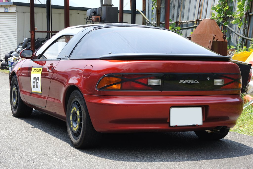 トヨタ・セラ(1993年式・EXY10)愛車紹介29台目 トヨタ 2017年07月21日 0 今回紹介する車両は「ドンキホーテジムカーナ2017」にエントリーされていたトヨタ・セラです。 年式:1993年式型式:EXY10 セラは1990年3月に発売された「バタフライドア」が特徴的な車です。ドアが斜め前方に持ち上がるドアは類似形状を含め一般的に「ガルウィングドア」と呼ばれています。ガルウィングには「シザーズドア」「ランボルギーニドア」「バタフライドア」などがあり、セラは正確に分類すると「バタフライドア」になります。他にも、グラストップと呼ばれる車体の上半分がほぼガラスとなっていることが特徴的です。バタフライドアとグラストップを採用したため、重心が高く重い車でした。 愛媛県伊予郡砥部町よりエントリーされていました。サービスエリアでドアを開けると珍しがられるので、注目されることを楽しんでいるとのことです。レクサス・RXやトヨタ・86にも貼られているアルミテープがフロントバンパーに貼り付けられています。「放電用アルミテープでの空力最適化」が行えるそうですが、効果が気になりますね。外部リンク:トヨタのアルミテープがもたらす驚きの効果