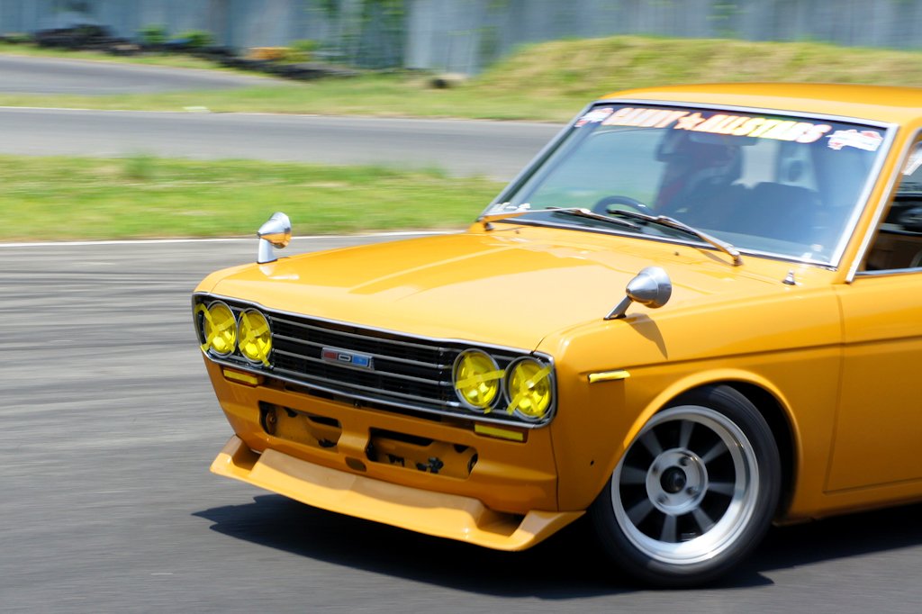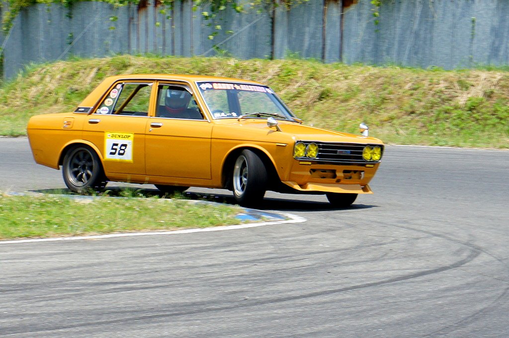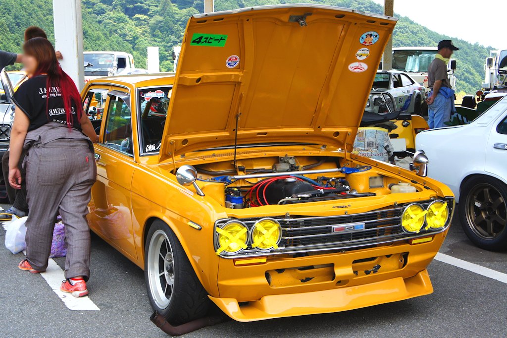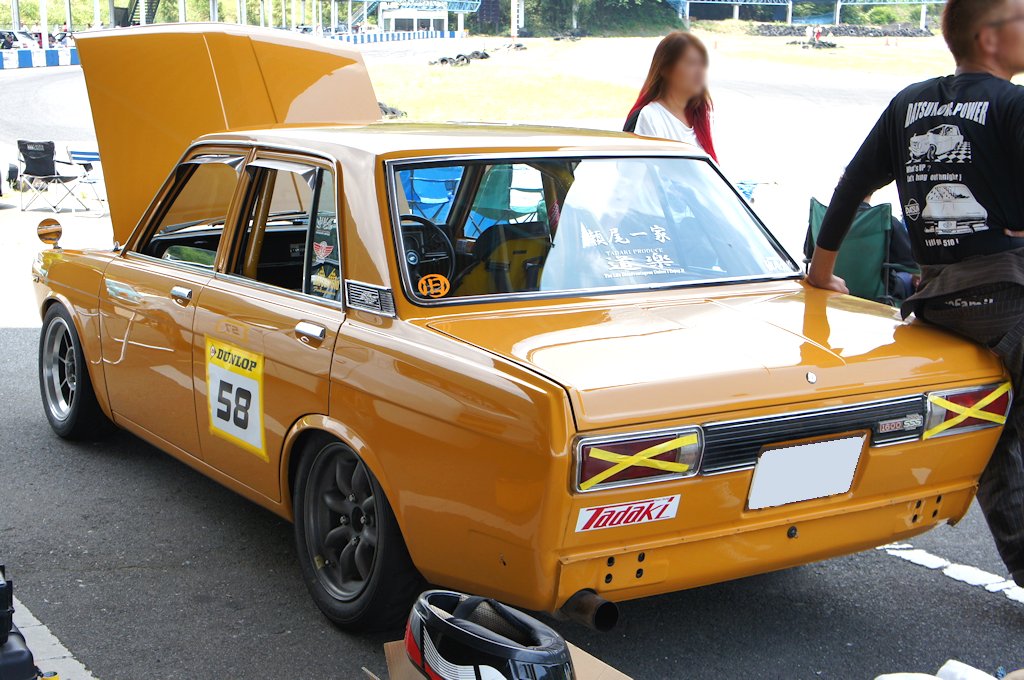 ニッサン・ブルーバード(1968年式・H510)愛車紹介45台目 ニッサン 2017年08月06日 0 今回紹介する車両は「ドンキホーテジムカーナ2017」にエントリーされていたニッサン・ブルーバードです。 年式:1968年式型式:H510 3代目ブルーバードは1967年8月15日に発売されました。歴代ブルーバードシリーズの中で大きな成功を収めたモデルです。フェンダーからリアに流れるスーパー・ソニック・ラインと呼ばれる直線的で彫りの深いシャープなデザインが特徴的です。フロントドアガラスの三角窓は換気装置の強化により省略され、明るく広いウインドウを採用しています。発売当初はL型と呼ばれる新開発の水冷直列4気筒 SOHCエンジンを搭載した、量販モデルである1.3LのL13型と、上級モデルである1.6LのL16型を積んだ「SSS(スーパー・スポーツ・セダン)」のラインアップでした。1969年9月に北米の安全基準に合わせるため、衝撃吸収ダッシュボードを採用しインパネ形状も変更しました。外装の変更点はラジオアンテナをAピラーへ移動する改良が行われました。1970年9月には直列4気筒SOHC L18型 (1770cc) を搭載した1800SSSが追加されました。ブルーバードは「第18回東アフリカサファリラリー」にて総合優勝とチーム優勝の2冠を達成し、「ラリーの日産」のイメージを確立しました。ラリーでの活躍ぶりもあり人気を高め、史上初めて北米市場でヒットした日本車となりました。 愛媛県西条市よりエントリーされていました。4ドアセダンの1600SSSです。すごい排気音がする車かと思えば、ジムカーナに来る途中、タコ足が割れたそうです。排気漏れをおこしパワーダウンしているのが気になります。