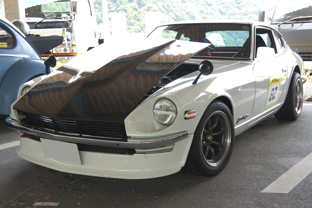 ニッサン・フェアレディZ(1976年式・S30)愛車紹介69台目 ニッサン 2017年08月29日 0 今回紹介する車両は「ドンキホーテジムカーナ2017」にエントリーされていたニッサン・フェアレディZです。 年式:1976年式型式:S30 フェアレディZ は1969年から1978年に発売されました。ジャガーやポルシェ並みのスペックと美しいデザインに加え廉価であったことから、北米市場を中心に大ヒットしました。約10年に渡って生産され、日本国内の販売台数は8万台、世界総販売台数ともなると55万台という、当時のスポーツカーとしては空前絶後の記録でした。日本国内でのみフェアレディZと名付けられ通称Zとして呼ばれています。北米ではニッサンブランドではなくダットサンブランドでした。ダットサンはDATSUNと表記されDATSUN Zとして販売されました。現地ではダッツンと呼ばれたため、「ダッツン・ズィー」の愛称で親しまれ、Z好きのオーナーからはZ-CAR(ズィー・カー)とも呼ばれています。日産自動車の輸出モデルである「DATSUN」を世界に知らしめた車です。漫画『湾岸ミッドナイト』では主人公の朝倉アキオが乗るZは、ミッドナイトブルー色のボディと、「狂おしく、身を捩るような」気味の悪い走りからの「悪魔のZ」と恐れられました。他にも『シャコタン☆ブギ』のアキラが乗る「240Z(240は排気量2400ccの意味)」、『よろしくメカドック』では「ナベさんのZ」、『GTroman』では「Z432(432は4バルブ、3キャブレター、2カムシャフトの意味)」等、多くの漫画に登場し人気でした。 愛媛県四国中央市よりエントリーされていました。3.1リッターフルチューンということでした。