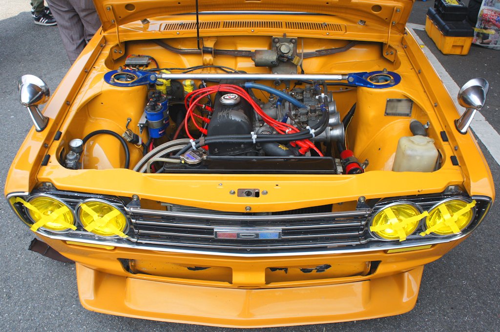 ニッサン・ブルーバード(1968年式・H510)愛車紹介45台目 ニッサン 2017年08月06日 0 今回紹介する車両は「ドンキホーテジムカーナ2017」にエントリーされていたニッサン・ブルーバードです。 年式:1968年式型式:H510 3代目ブルーバードは1967年8月15日に発売されました。歴代ブルーバードシリーズの中で大きな成功を収めたモデルです。フェンダーからリアに流れるスーパー・ソニック・ラインと呼ばれる直線的で彫りの深いシャープなデザインが特徴的です。フロントドアガラスの三角窓は換気装置の強化により省略され、明るく広いウインドウを採用しています。発売当初はL型と呼ばれる新開発の水冷直列4気筒 SOHCエンジンを搭載した、量販モデルである1.3LのL13型と、上級モデルである1.6LのL16型を積んだ「SSS(スーパー・スポーツ・セダン)」のラインアップでした。1969年9月に北米の安全基準に合わせるため、衝撃吸収ダッシュボードを採用しインパネ形状も変更しました。外装の変更点はラジオアンテナをAピラーへ移動する改良が行われました。1970年9月には直列4気筒SOHC L18型 (1770cc) を搭載した1800SSSが追加されました。ブルーバードは「第18回東アフリカサファリラリー」にて総合優勝とチーム優勝の2冠を達成し、「ラリーの日産」のイメージを確立しました。ラリーでの活躍ぶりもあり人気を高め、史上初めて北米市場でヒットした日本車となりました。 愛媛県西条市よりエントリーされていました。4ドアセダンの1600SSSです。すごい排気音がする車かと思えば、ジムカーナに来る途中、タコ足が割れたそうです。排気漏れをおこしパワーダウンしているのが気になります。